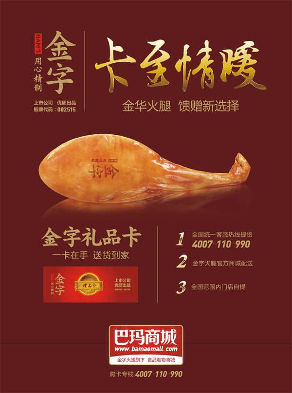 作為一家上市公司——金字火腿推出的禮品卡,禮品卡多年信譽(yù),廣受消費(fèi)者的真心歡迎,每年回頭客無(wú)數(shù),而更重要的是,金字每年把產(chǎn)品的品質(zhì)和備貨做到更好,禮品卡內(nèi)產(chǎn)品都是公司層層品質(zhì)歷練的熱銷產(chǎn)品,用火腿、臘肉、香腸這些實(shí)在心意,去感動(dòng)每一位朋友。如今,更是可以通過(guò)手機(jī)微信關(guān)注金字火腿,盡享中華美食同時(shí),與朋友分享禮品卡里所蘊(yùn)含的真情實(shí)意。