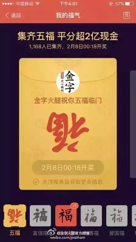 自前幾天支付寶將“集5福,搶2億+紅包”的活動(dòng)規(guī)則公布后,一時(shí)間,有關(guān)福卡換贈(zèng)的話(huà)題強(qiáng)行霸屏。在有金字粉絲集齊了五福后,金字順勢(shì)在微博平臺(tái)上策劃的#我與2億只差一張???的微話(huà)題就引發(fā)了高達(dá)4.6億的閱讀量,網(wǎng)友們通過(guò)點(diǎn)贊評(píng)論及轉(zhuǎn)發(fā)分享的方式,第一時(shí)間表達(dá)了自己對(duì)于五福??ê痛和?億紅包的高度期待!